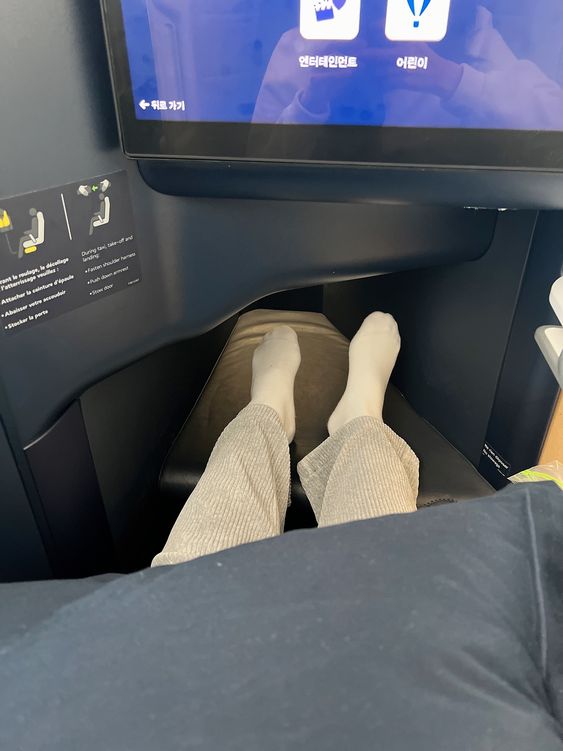 앉기 전, 의자에는 베개와 담요, 헤드셋이 있었고, 제공되는 파우치에 여러 아이템들을 사용할 수 있었습니다.
